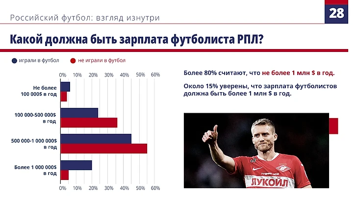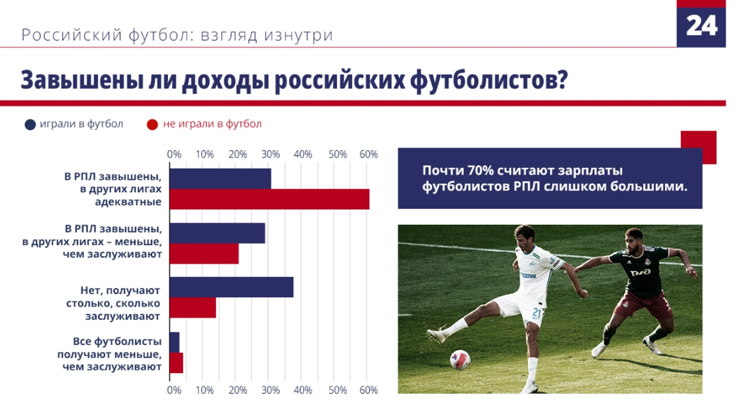 Неудивительное: люди с футбольным опытом считают зарплаты адекватными, остальные – завышенными.