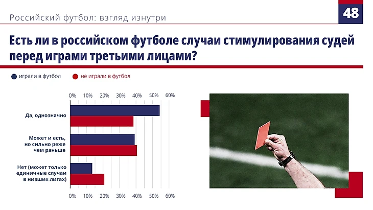 Больше половины тех, кто играл в футбол, уверены, что судей иногда стимулируют перед матчами. Эмоции или выводы на основе опыта?