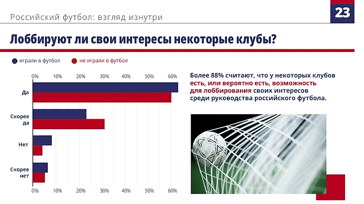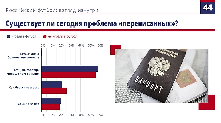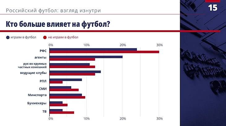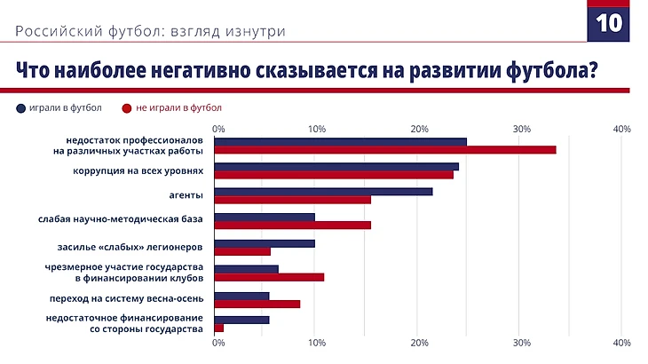 Суть исследования проста: в начале 2021-го авторы (Эдуард Безуглов, Антон Еманов, Дмитрий Кортава и Артем Рыженко) анонимно опросили почти полторы сотни людей, связанных с российским футболом (58% из них – бывшие или нынешние футболисты). Мнениями делились: 12 игроков ФНЛ, 8 главной сборной России, 2 главных тренера РПЛ, один главный тренер ФНЛ, 4 тренера сборных разных возрастов, 7 руководителей клубов и 11 футбольных чиновников, а также журналисты, судьи, ветераны, агенты.
