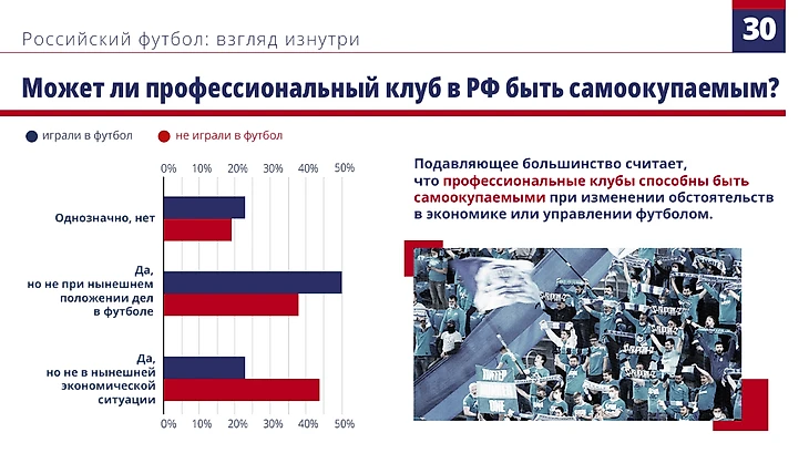 23% футбольных людей и 19% нефутбольных уверены, что футбол – заведомо убыточен. И при этом вообще все уверены, что в нынешней ситуации самоокупаемые клубы – фантастика.