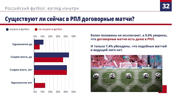 Слайд, после которого нужно бить тревогу и включать мигалки. Только 2% людей с футбольным опытом считают, что договорных матчей в РПЛ нет.