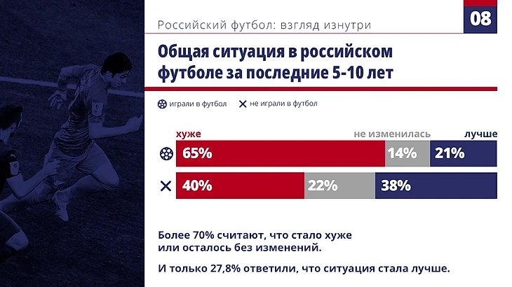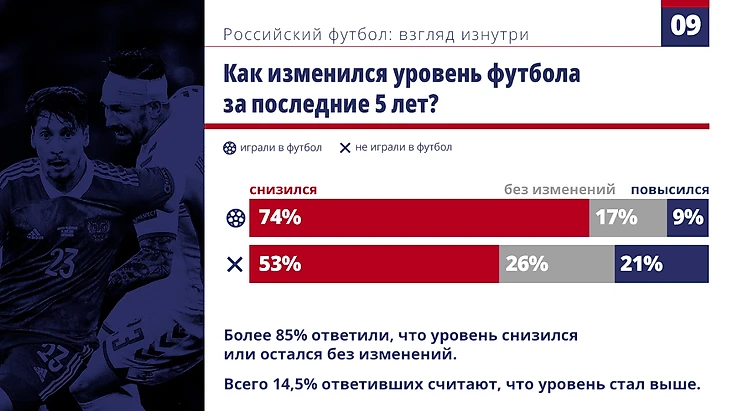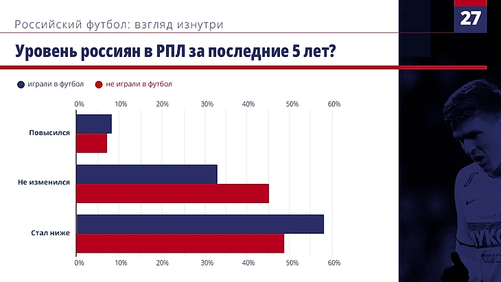 Людей с игровым опытом больше не устраивают российские футболисты. Только около 7% считают, что уровень наших игроков повысился.