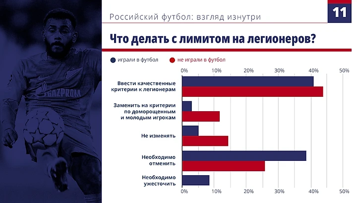 Дальше – практические советы. За тотальную отмену лимита 38% тех, кто играл в футбол, но большинство за систему посложнее – когда легионеров ограничивают не по количеству, а по уровню – как в АПЛ.