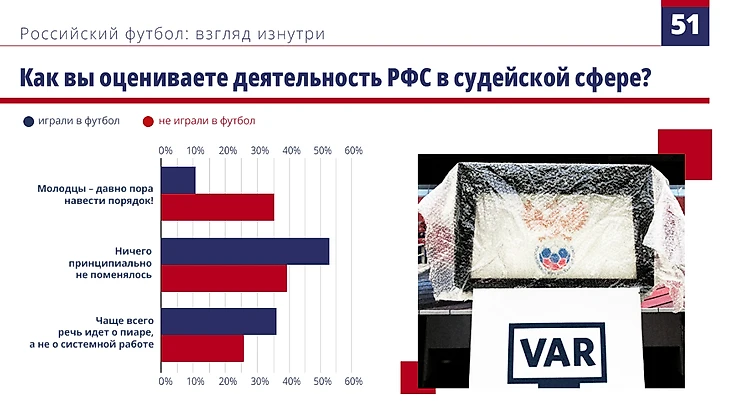 • Самое страшное: более 30% опрошенных считают, что договорняки не ушли из РПЛ, а судьям все еще дают взятки.