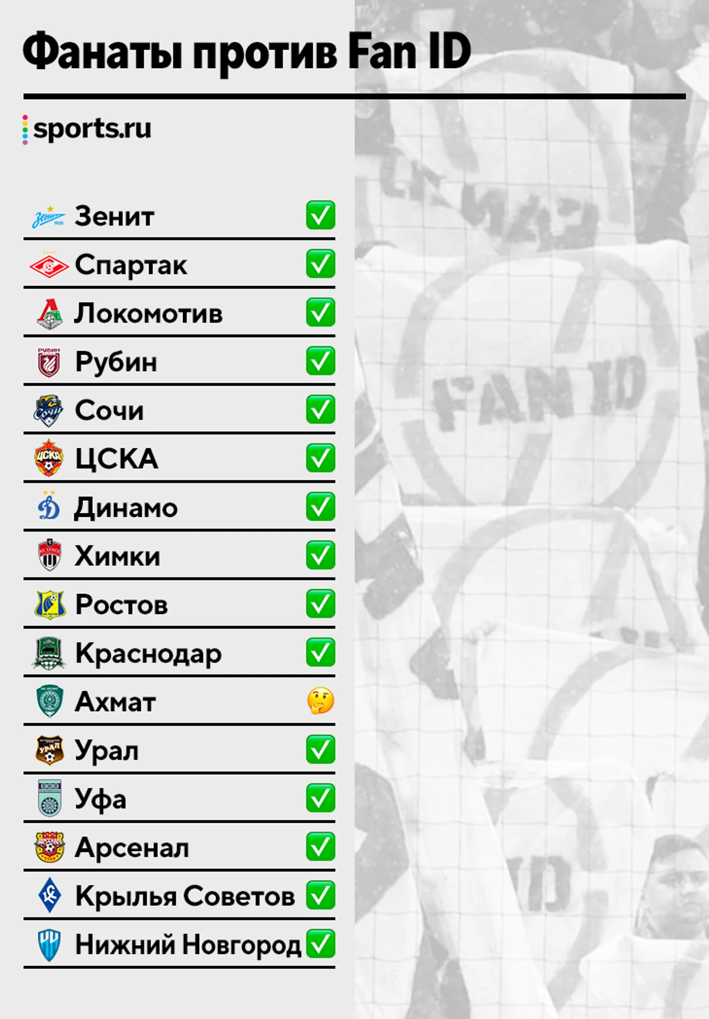 Фанаты 15 клубов РПЛ – против Fan ID. Остался только «Ахмат»