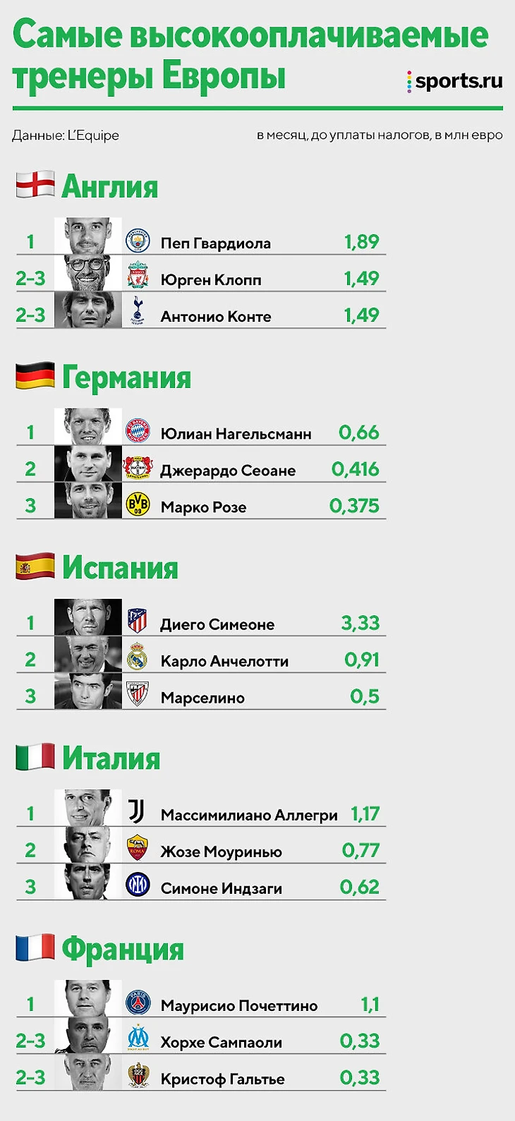 Французский L’Equipe опубликовал ежегодный рейтинг зарплат в топовых европейских лигах. По традиции в кошелек залезли не только к футболистам, но и к тренерам.
