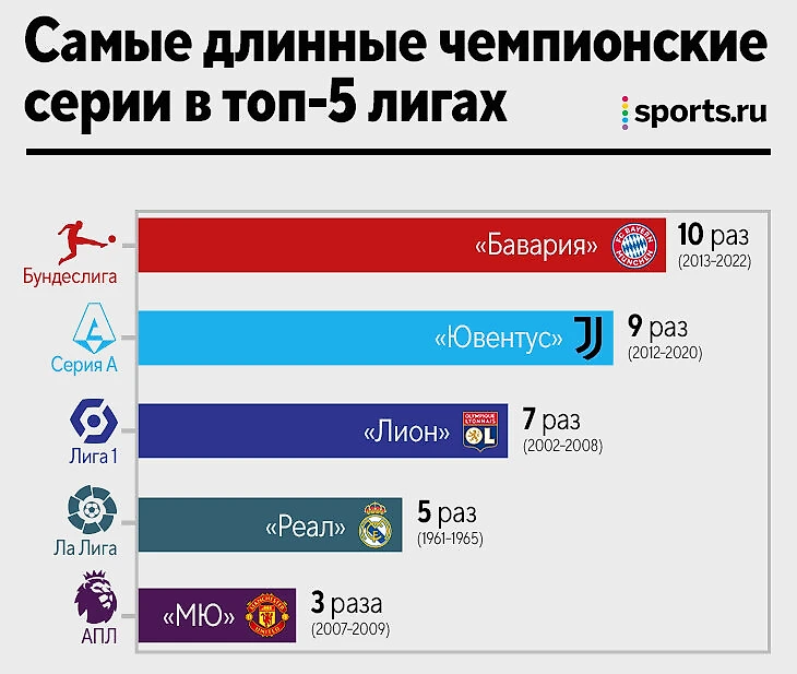 Сразу оговоримся: на картинке от Англии представлен только «Ман Юнайтед» (три победы в чемпионате подряд), потому что ограничивались рамками АПЛ, существующей с 1992 года. А вообще в высшем английском дивизионе три раза подряд побеждали 4 клуба – тот же «Манчестер Юнайтед» (дважды), «Ливерпуль», «Арсенал» и «Хаддерсфилд».