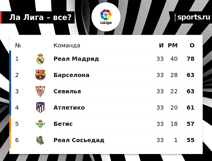 • «Реалу» необходимо набрать всего одно очко за 5 следующих матчей, чтобы стать чемпионом. После серии неудач «Барса» самоустранилась – а ведь еще неделю назад Хави собирался всерьез побороться за титул.