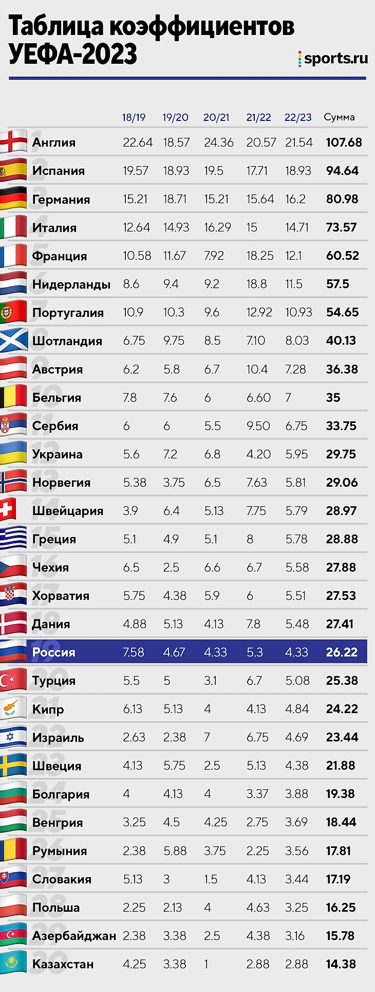 Сейчас УЕФА фактически заморозил рейтинг России. За следующий сезон нам выдали 4,333 балла – худшую сумму за последние 5 лет (сезон-2020/21), но фактически мы в последние годы выступали не сильно лучше (7,583, 4,666, 4,333, 5,300) – эта сумма и так ставила нас летом 2022 года на 19-е место в Европе. В прошлом сезоне баллы российских клубов – 20-я сумма в Европе. Фактически усредненно мы были 19-20 на дистанции последних лет. И нам выдали баллы такого же уровня.