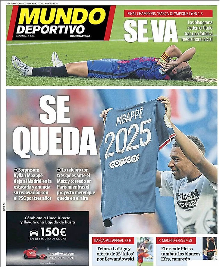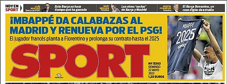 Каталонские издания ожидаемо отреагировали на решение Килиана гораздо мягче. Издание Sport уделило большую часть обложки проигрышу «Барселоны» в финале женской ЛЧ, но все же нашли место для Килиана. «Мбаппе отмахивается от Мадрида и продлевает контракт с «ПСЖ», – гласила обложка.