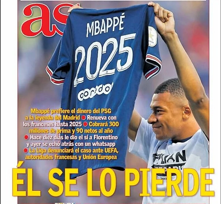 Газета AS также не удержалась от критики в адрес Мбаппе. На свежей обложке: «Он многое теряет».