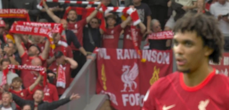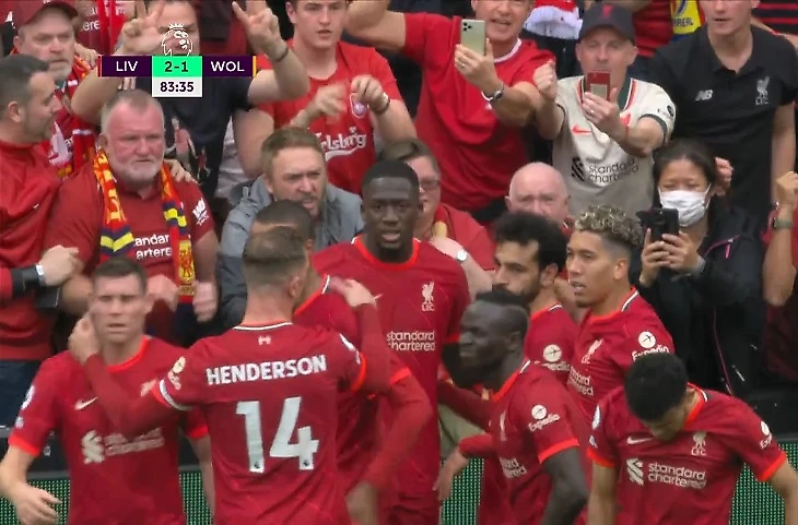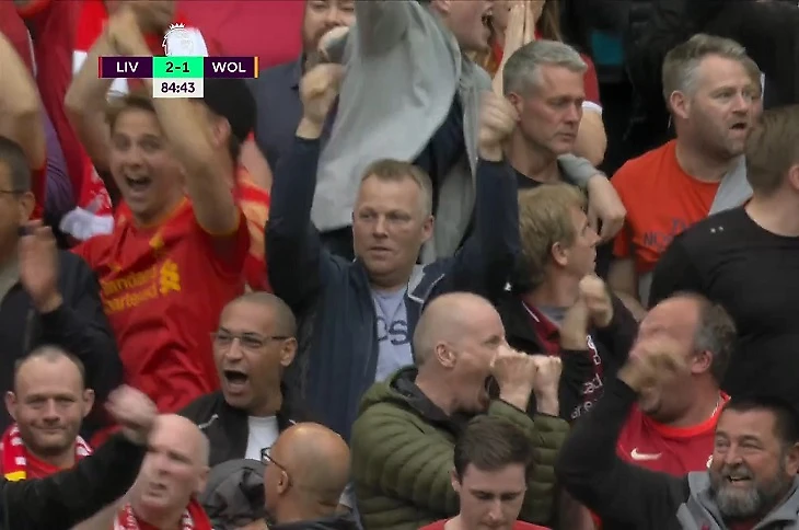 Игроки «Ливерпуля» празднуют гол с трибунами – и заодно узнают счет в параллельном матче. Мужчина в шарфе качает головой.