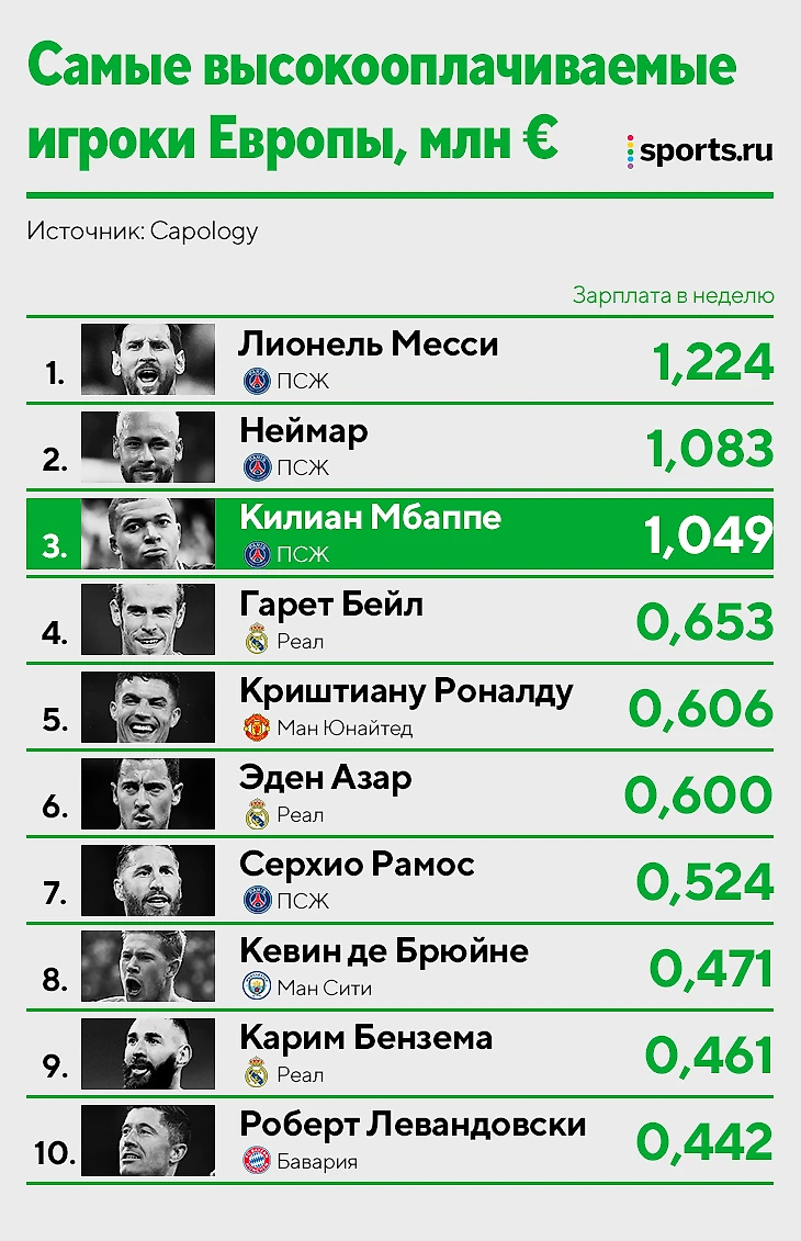 • Три первых места зарезервированы звездным трио «ПСЖ» Месси-Неймар-Мбаппе: все получают больше миллиона евро в неделю, однако Лео все равно немного оторвался. Контракт аргентинца заканчивается через два года. Чуть ниже Серхио Рамос – его цифры скромнее, но тоже выделяются на фоне того, что в этом сезоне испанец почти не играл.
