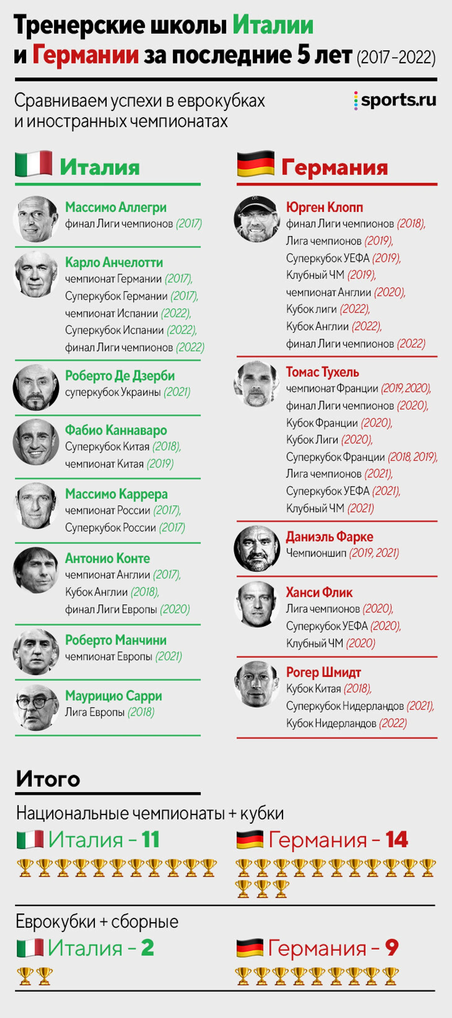 А какая из школ была сильнее и влиятельнее в последнее время? Мы взяли 5-летний отрезок (2017 – 2022) и отметили значительные успехи итальянских и немецких тренеров за пределами родных лиг. На картинке снизу зафиксированы победы в национальных чемпионатах и кубках, а также еврокубках (указаны и выходы в финалы ЛЧ и ЛЕ). Победы на клубных ЧМ тоже отнесем к еврокубкам как некое их продолжение.