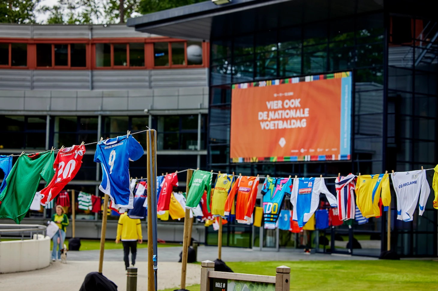 Перфомансом на тренировке футбольный союз не ограничился. На территории кампуса, в котором живут футболисты, сотрудники повесили 300-метровую веревку, на которую развесили формы разных любительских клубов. Впечатляет!