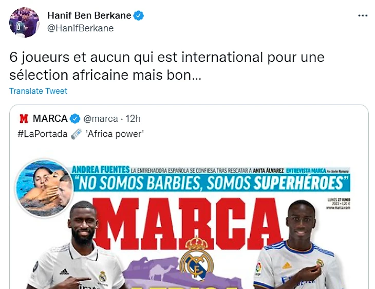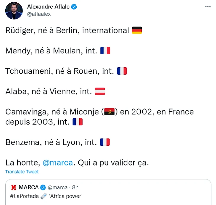 Журналист Le Parisien Александр Афлало напомнил о месте рождения игроков и резюмировал: «Стыд, Marca. Кто мог это утвердить».
