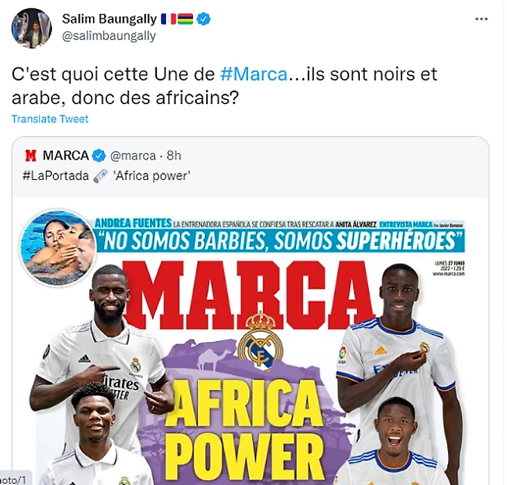 Телеведущий Салим Бонглли тоже недоволен: «Что это за первая полоса, Marca... они чернокожие и арабы, значит, африканцы?»