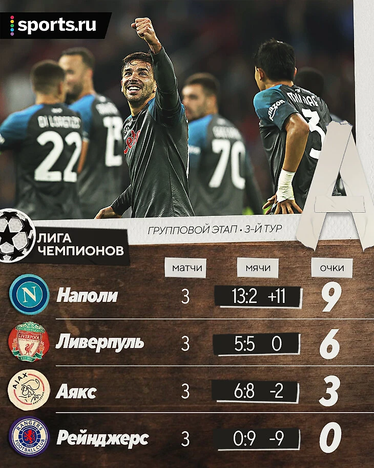 • «Наполи» громит в этой Лиге чемпионов абсолютно всех: 4:1 с «Ливерпулем», 3:0 с «Рейнджерс» и вот теперь 6:1 в Амстердаме. Неудивительно, что команда Спалетти возглавляет группу с 9 очками, тогда как у «Ливерпуля» 6 баллов, а у «Аякса» – 3.