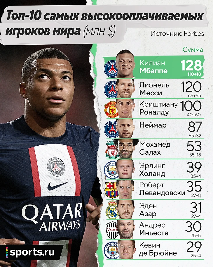 Мбаппе теперь зарабатывает больше всех в футболе, Роналду – третий, Азар и Иньеста еще в десятке