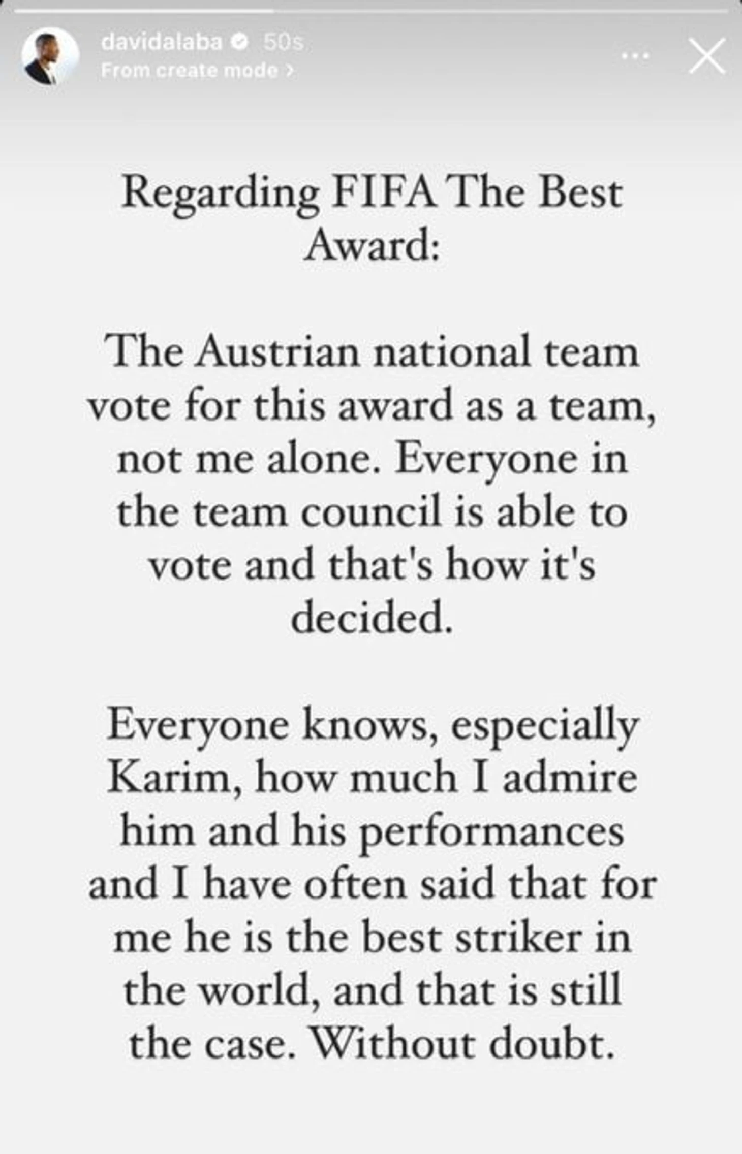 Футболисту пришлось объясняться. «Относительно премии The Best. Сборная Австрии голосовала как команда, не я один. Каждый член команды имел право голоса, так все и решалось.