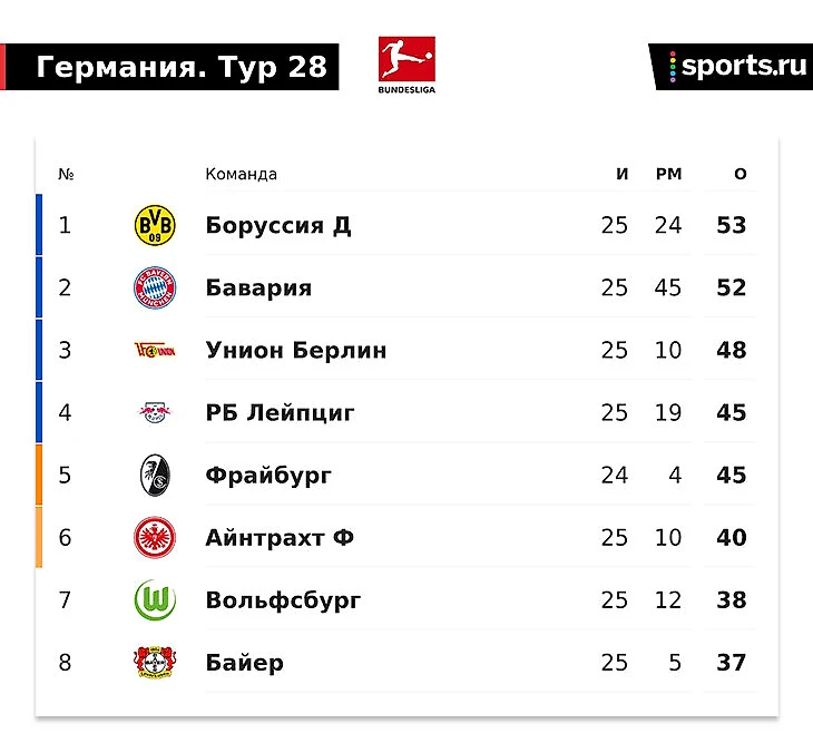 На первое место вышла дортмундская «Боруссия», она еще в субботу разгромила «Кельн» (6:1). Идут почти вровень, одно очко между. А матч между собой уже 1 апреля в Мюнхене, это следующий тур, сразу после паузы на сборные.