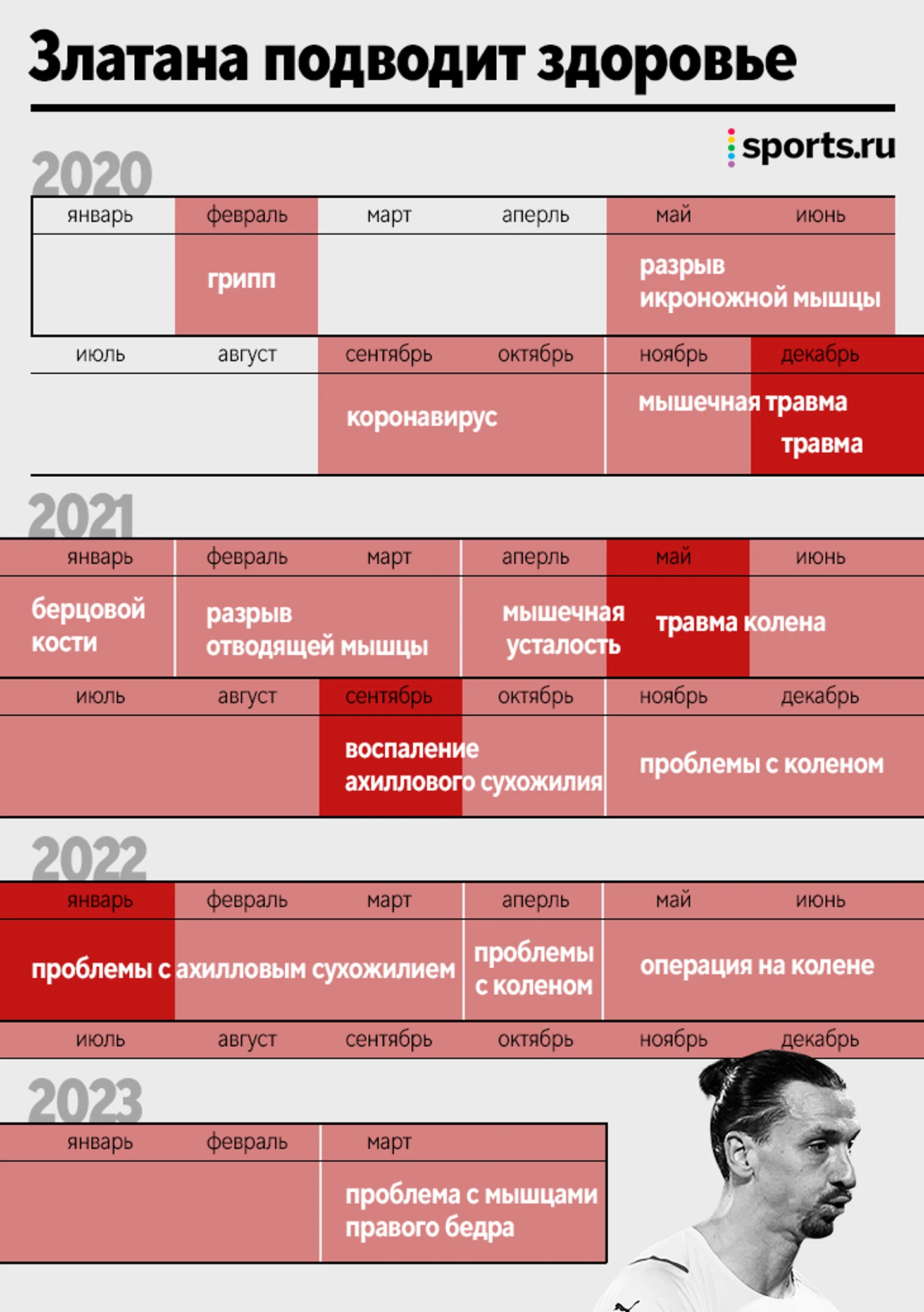 Златан вернулся в «Милан» в начале 2020-го, с тех пор выбывал аж 14 раз, 2 из них по болезни (грипп и коронавирус). В общей сложности пропустил аж 643 дня и 86 матчей.
