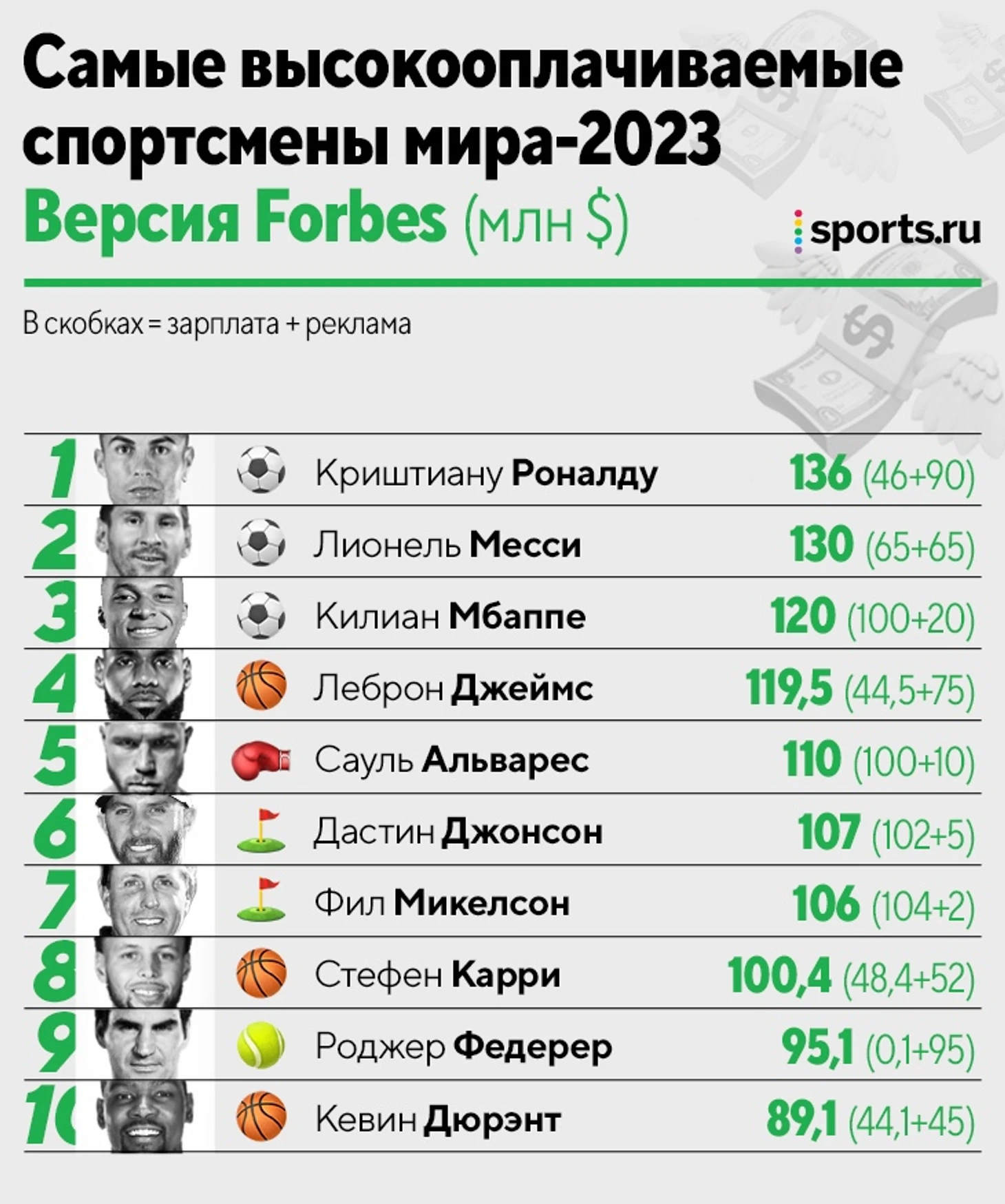 • Forbes не включает инвестиционные доходы (процентные платежи или дивиденды), но при этом учитывает выплаты от пакетов акций, проданных спортсменами.