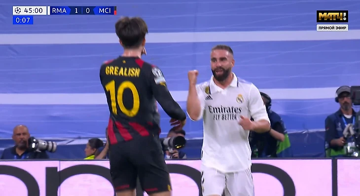 Первый тайм завершился победой «Реала», а перед самым перерывом поссорились Грилиш и Карвахаль. Они и до этого задирали друг друга – а уже здесь борьба была ожесточенной.
