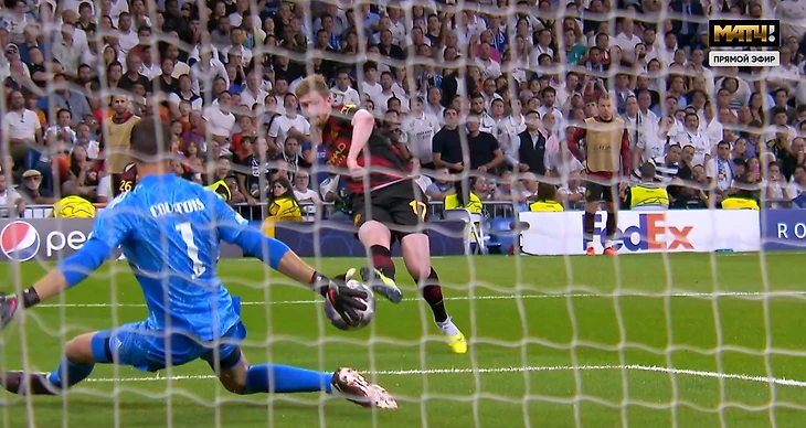 После перерыва «Реал» и «Сити» тут же обменялись опасными моментами: Бензема пробил выше после хорошей комбинации, в которой поучаствовали Винисиус и Карвахаль, а Де Брюйне не реализовал выход один на один с острого угла. Скорее всего, гол не засчитали бы из-за офсайда, но сэйв Куртуа все равно впечатлил.