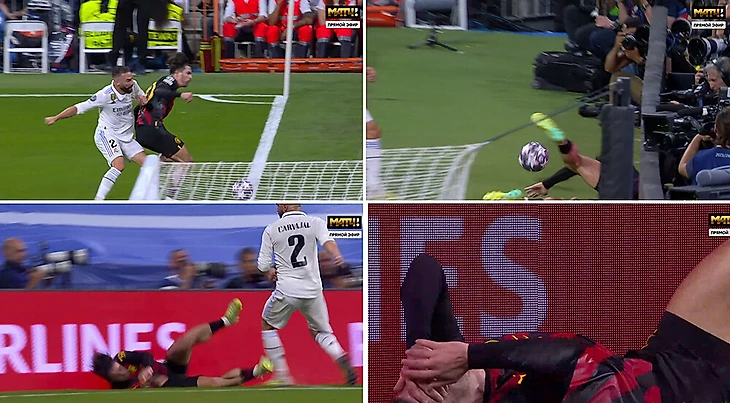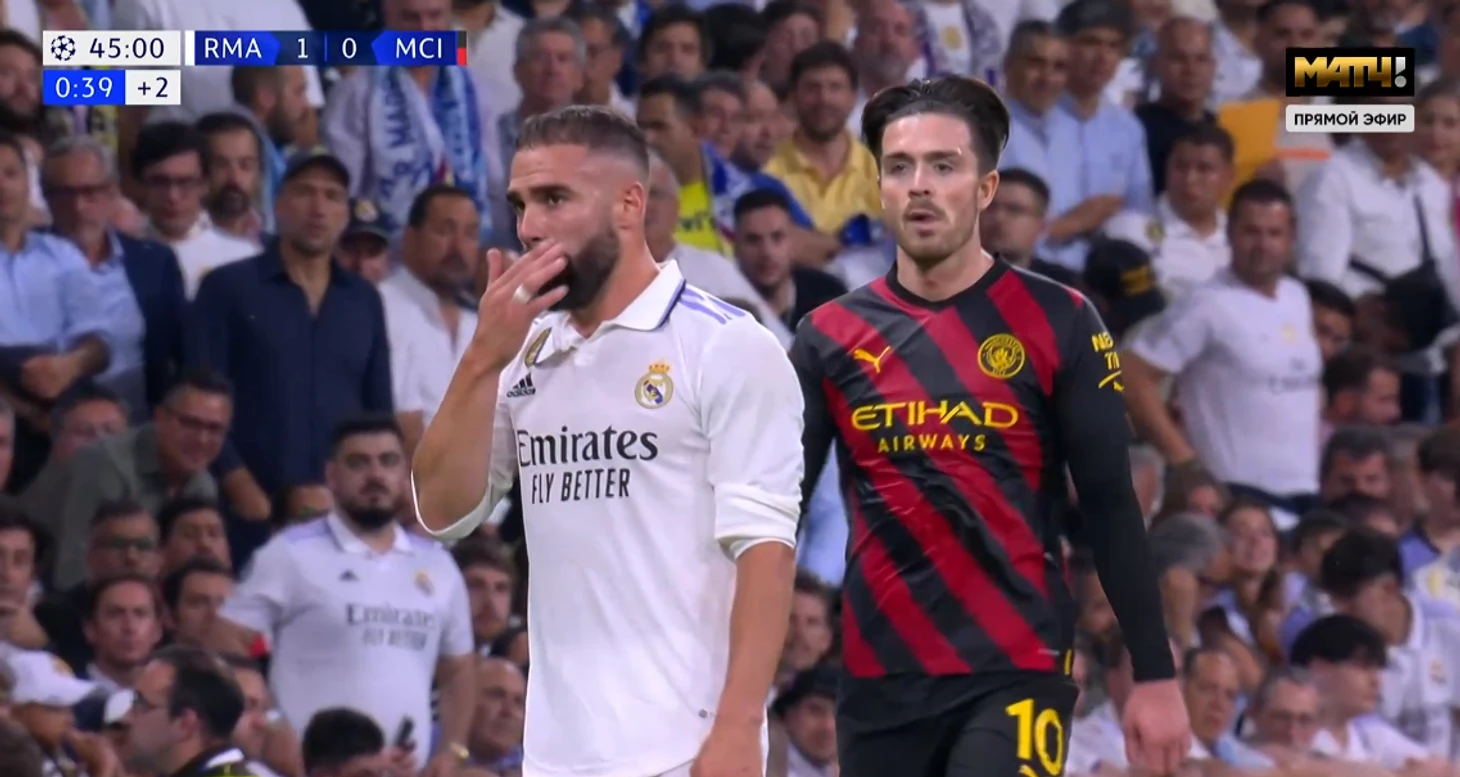 Карвахаль просто вытолкнул Грилиша за пределы поля: поддал локтем в спину, из-за чего Джек ударился о рекламный щит.