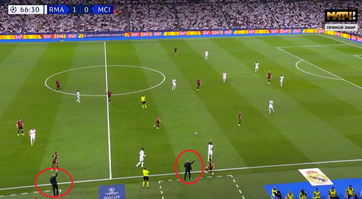 Отреагировали оба тренера. Гвардиола затряс пальцем лайнсмену, указывая, что мяч не вышел. Анчелотти поднял руку.