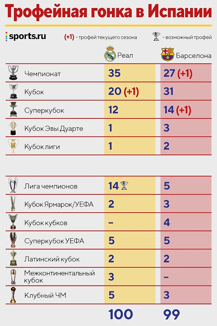 • Преимущество по победам в Лиге чемпионов и Кубке европейских чемпионов самое внушительное, доминация «Реала» вряд ли удивляет. В эпоху КЕЧ у «Барсы» был только один титул – самый последний, в 1992-м, а у «Реала» – шесть. В современном формате каталонцы выиграли четыре трофея, мадридцы (после паузы в 32 года) – уже восемь. Если победить в двух самых важных оставшихся матчах сезона, получится добиться в этой графе трехкратного превосходства.