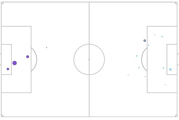 И-и-и, кажется, больше ничего достойного (кроме момента, когда Майкл Оливер должен был удалить Матео Ковачича). Не верите нам, посмотрите на статистику. На левой стороне – карта ударов «Сити» с общим xG 0,41. Справа – удары «Арсенала» с xG 0,55. Решающий удар Мартинелли оценили на 0,04 xG.