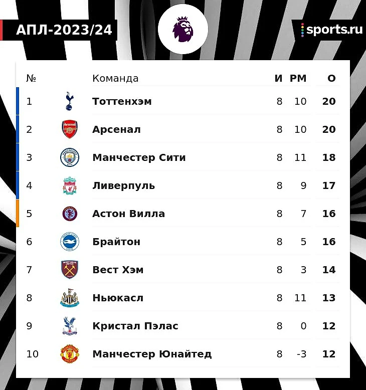 И не забудем про главное – таблицу. «Арсенал» набрал 20 очков и достал «Тоттенхэм». Да-да, в АПЛ сейчас лидируют «Арсенал» и «Тоттенхэм»!