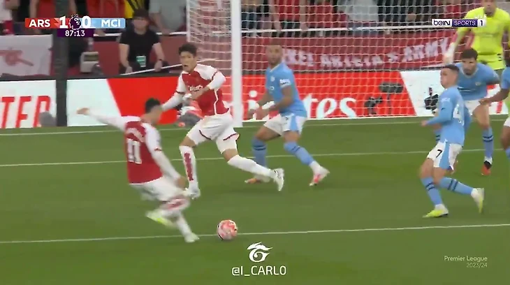 Победный мяч влетел в ворота «Сити» на 86-й минуте. Габриэл Мартинелли подхватил мяч у штрафной и решился на удар. Мяч попал в лицо Натану Аке, сильно изменил направление и дезориентировал Эдерсона – у него уже не было шансов среагировать.