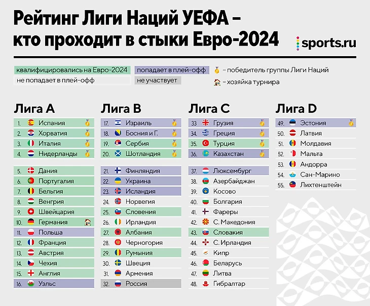Раньше квалификация на Евро и ЧМ заканчивалась стыками между командами, занявшими вторые или третьи места в группах. Сейчас отбор другой – в плей-офф попадают по результатам выступлений в Лиге наций-2022/23. Места в плей-офф получают победители групп в дивизионах А, В и С.