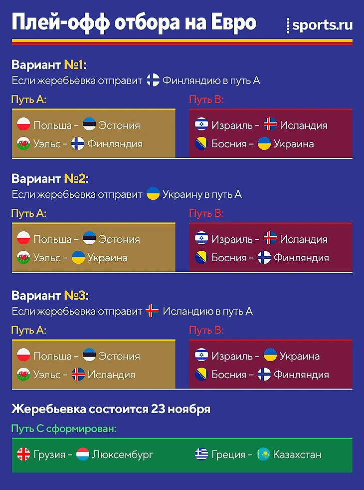Что еще ясно: в сетке В в разных парах будут Израиль и Босния и Герцеговина (полуфиналы проведут дома); в сетке А Польша примет Эстонию, а Уэльс – одну из трех возможных команд.