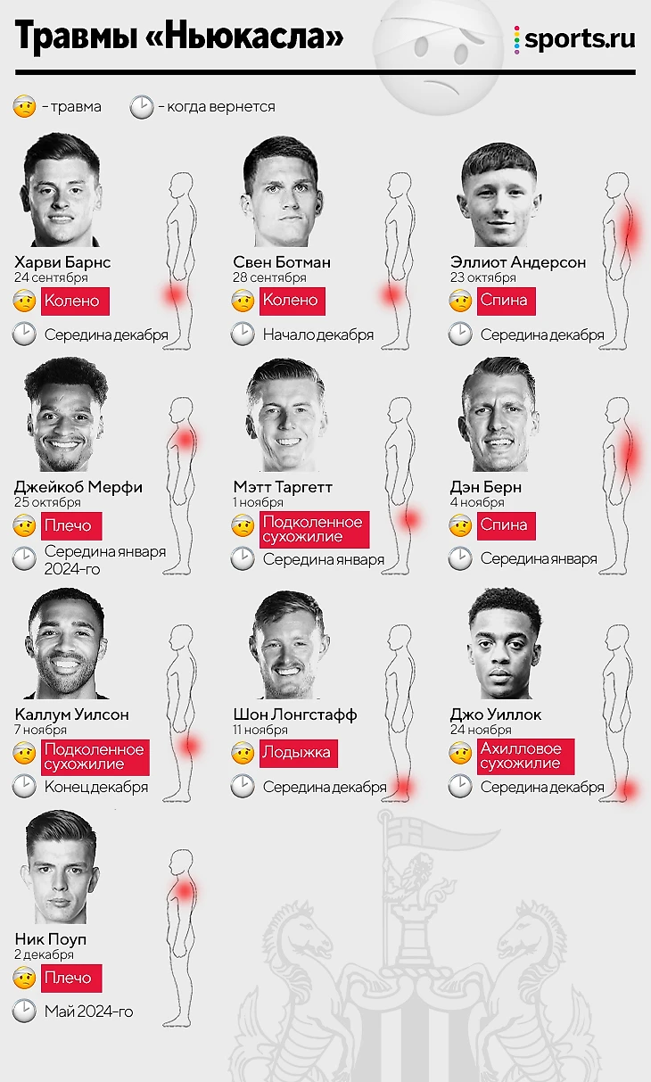 Травмы накрыли «Ньюкасл» – минус 10 игроков с сентября. Поуп вылетел вообще до мая – Де Хеа может его заменить