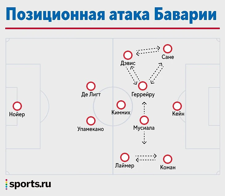 1. Странный левый фланг, где Геррейру мешается Дэвису и Сане. Убери Геррейру – фланг ничего не потеряет. Будут скоростные проходы Дэвиса и смещения Сане – им даже проще, ведь Геррейру притягивает +1 соперника.