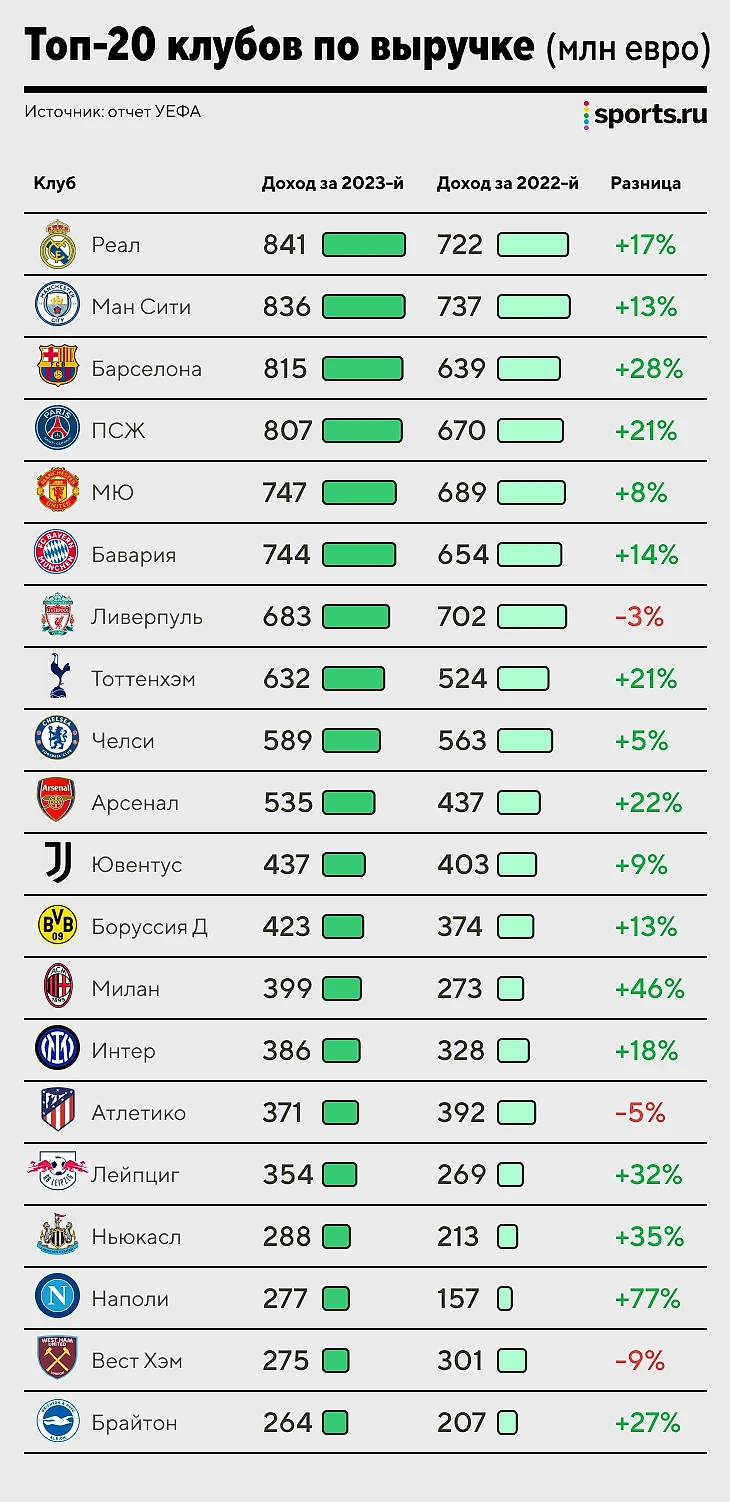 А у Тоттенхэма вообще проблема: одинаковая выручка в 2022 и 2023 гг., но при этом прирост 21% показан