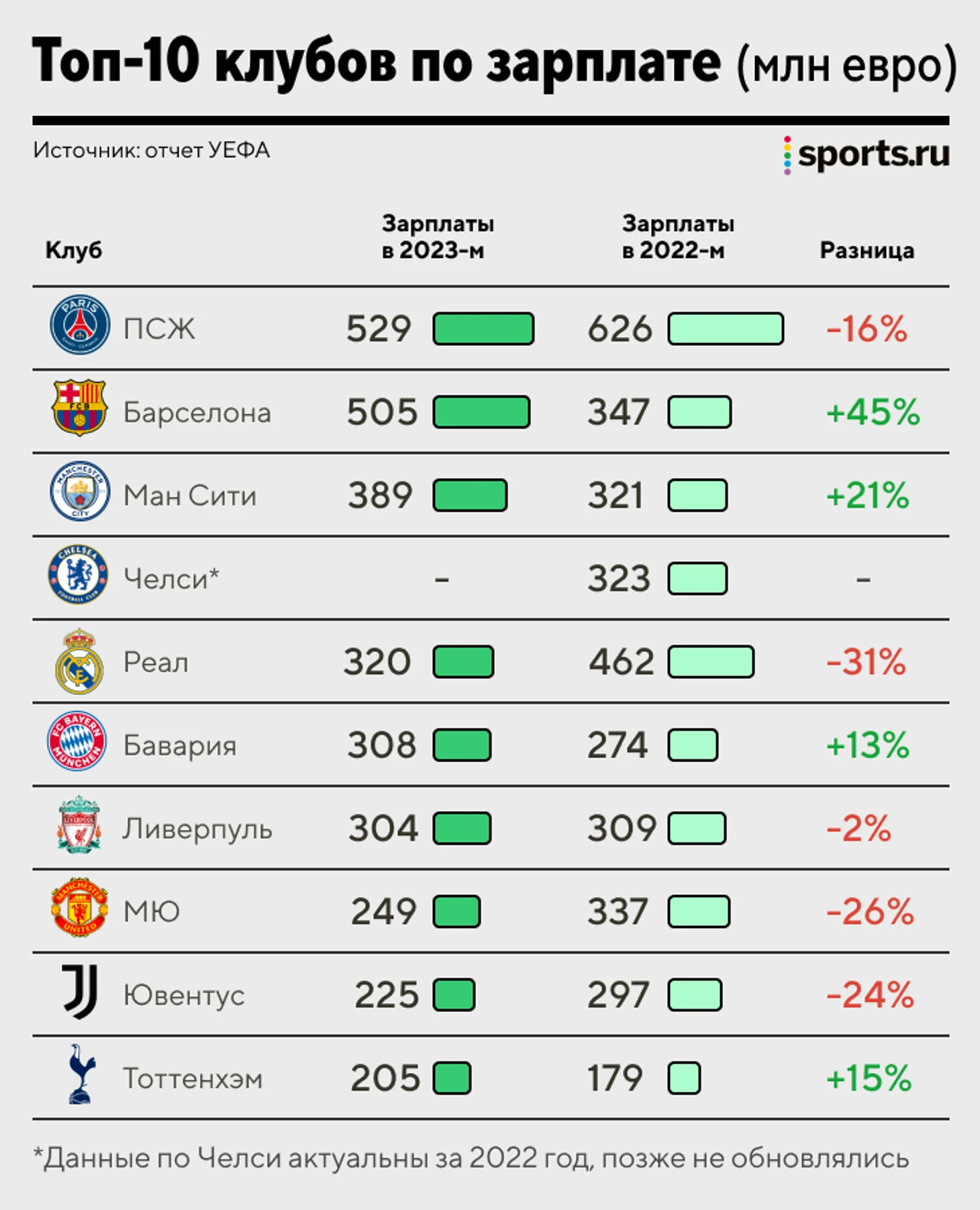 ● В другую сторону выделился «Реал»: сократил зарплатную ведомость аж на треть по сравнению с прошлым годом. Помогли уходы нескольких статусных игроков и в целом расчистка состава летом 2023-го. Кроме мадридцев преуспели «ПСЖ», «Ливерпуль», «МЮ» и «Ювентус».