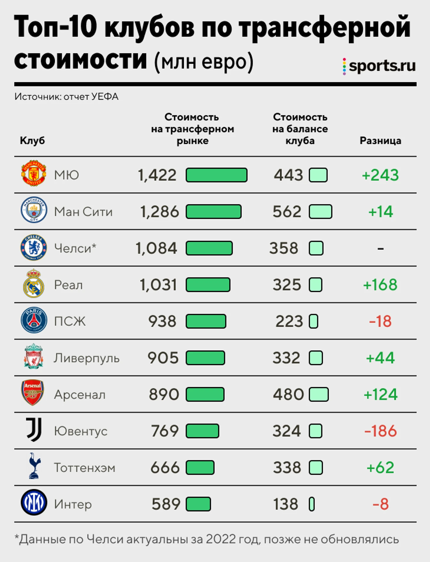 ● На вершине списка манчестерские клубы: стоимость «МЮ» почти достигла 1,5 млрд евро, «Ман Сити» – 1,286 млрд.