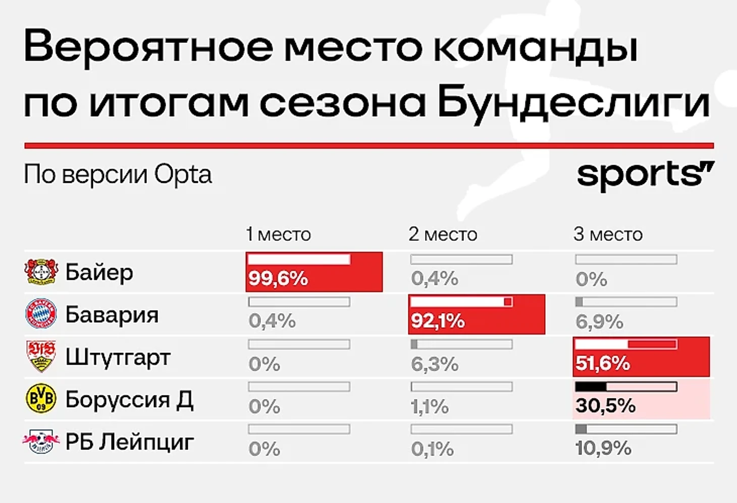 Euroclubindex.com высчитывает шансы на титул в процентах: учитывают силу команд, форму, расписание и другие факторы. Сайт дает 99,7% на чемпионство «Байера» и всего 0,3% - на «Баварию». Чисто теоретически по очкам чемпионами могут стать «Штутгарт» и «Боруссия», но в таблице они уже не фигурируют.