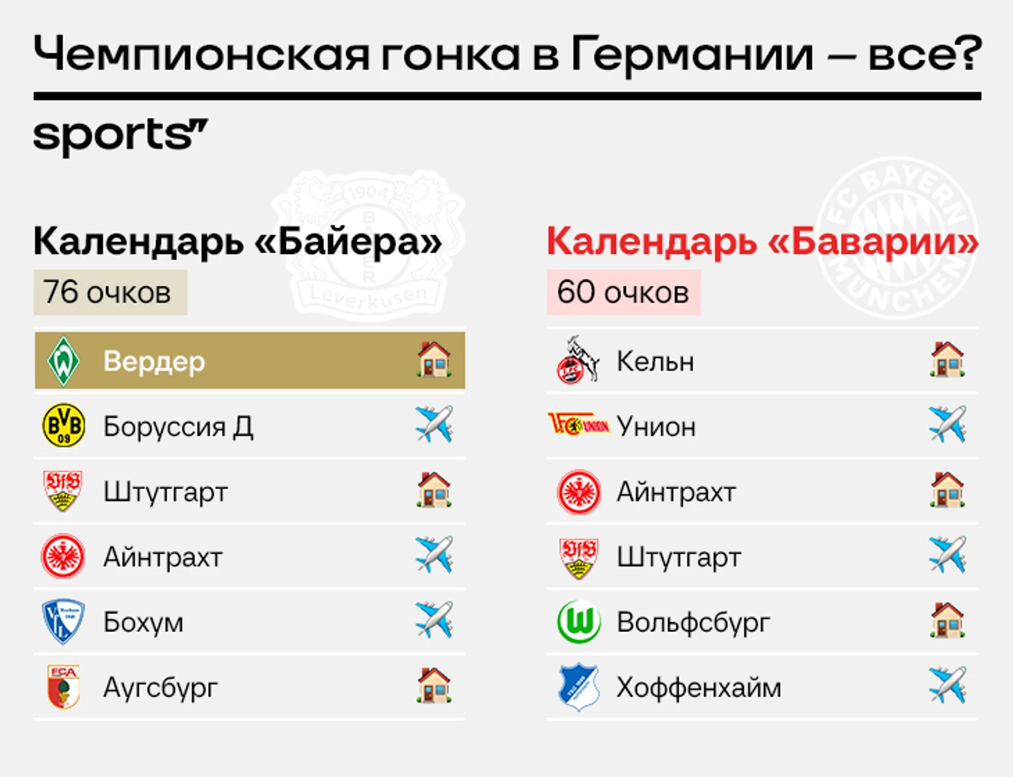 Даже если команда Алонсо поплывет, ей хватит двух ничьих для титула. При условии, что «Бавария» выиграет все оставшиеся матчи.