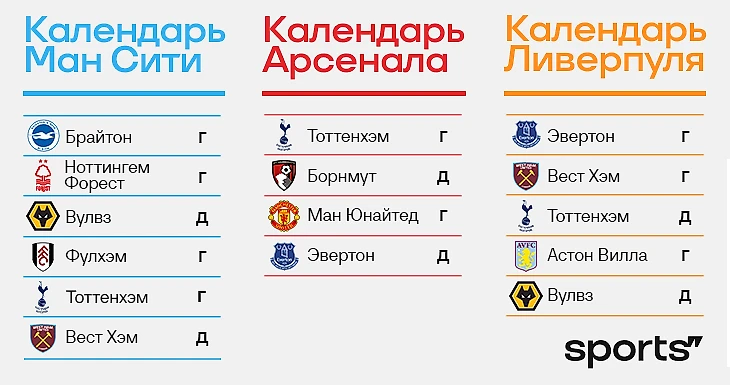 У Арсенала таким образом 2 серьезных соперника: ТТХ и МЮ(оба в гостях), у Ливерпуля тоже 2: ТТХ(дома), АстонВилла(в гостях), у Сити: ТТХ(в гостях).