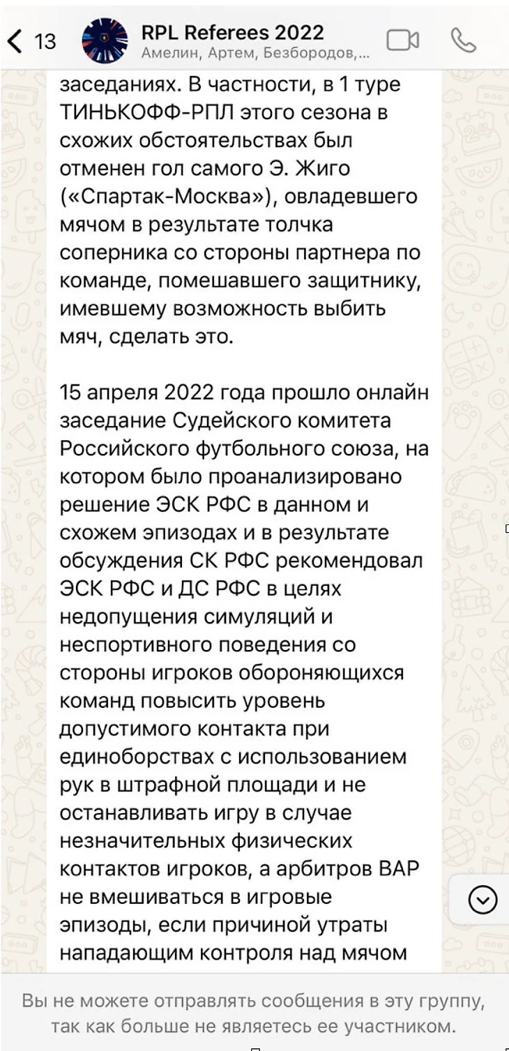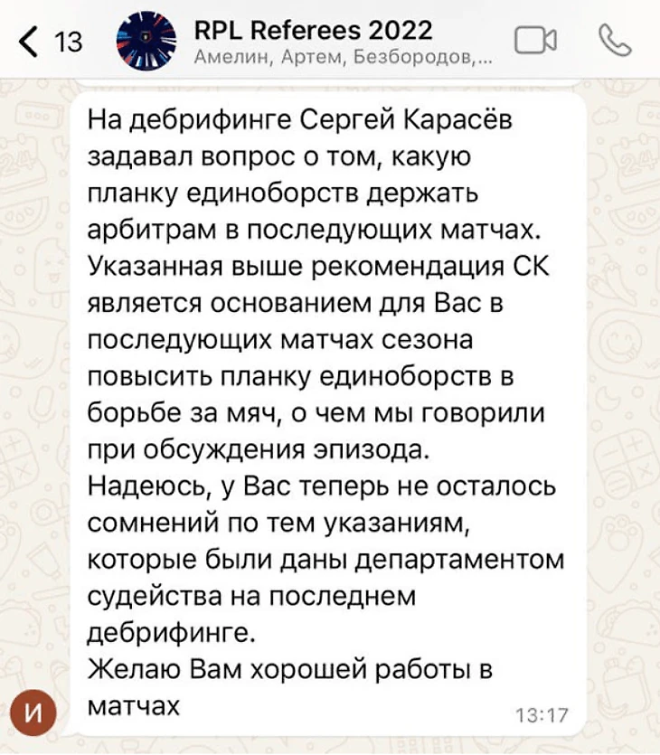 – Мы получили рекомендации от департамента на вопрос Карасева, что делать в похожих ситуациях. Ответ был такой: при мелких задержках в борьбе за мяч продолжать игру. Департамент судейства продублировал эту информацию в группе в вотсапе, скрины у меня все есть.