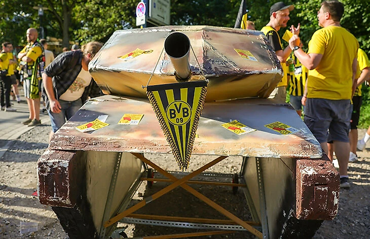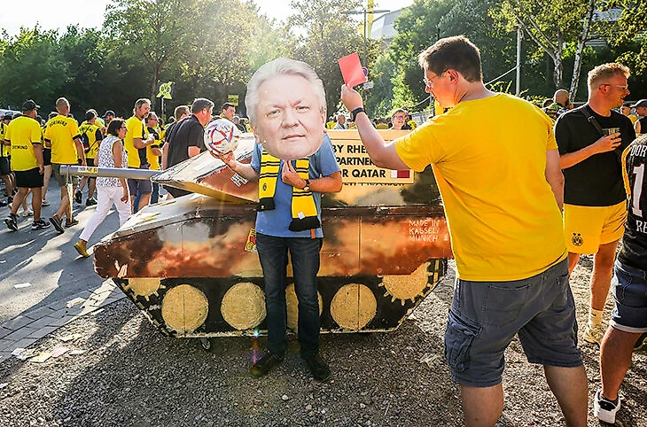 Возле стадиона поставили картонный танк с надписью: «Изготовлено Rheinmetall, гордым партнером «Боруссии». Сделано для Катара». Рядом же – активист с картонной головой главы концерна Армина Паппергера.