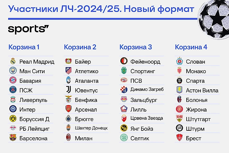 ● Вместо прежних групп каждый клуб скорее узнает список соперников. Возможный ЛЧ-путь «Реала» из первой корзины: «ПСЖ», «Ливерпуль», «Милан», «Бенфика», ПСВ, «Селтик», «Болонья», «Штутгарт».