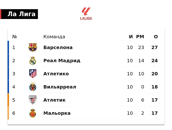 «Барса» лидирует в Ла Лиге, отрыв от «Реала» – три очка. Задел перед класико.