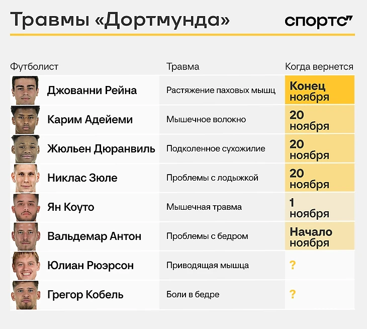 У «Дортмунда» действительно много травм – и со скамейки усилиться почти некем. Всего вылетело восемь футболистов, на основу рассчитывают все, кроме 18-летнего Жюльена Дюранвиля.